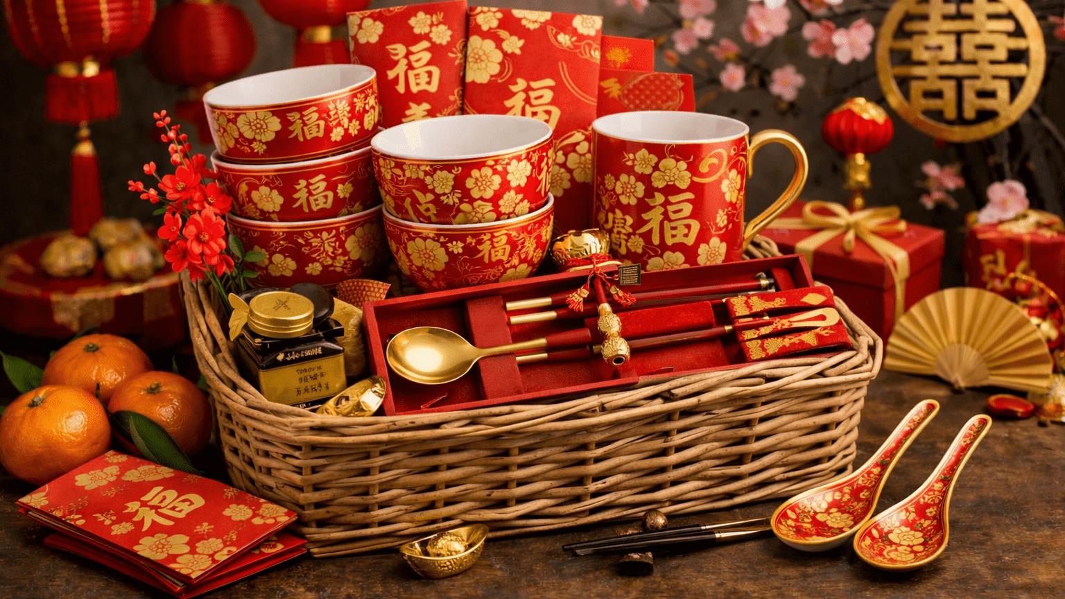 Mangkok, sumpit, atau piring kecil bermotif oriental sering dijadikan simbol kelimpahan. Ide hampers Imlek ini cocok untuk keluarga baru atau pasangan yang baru menikah.